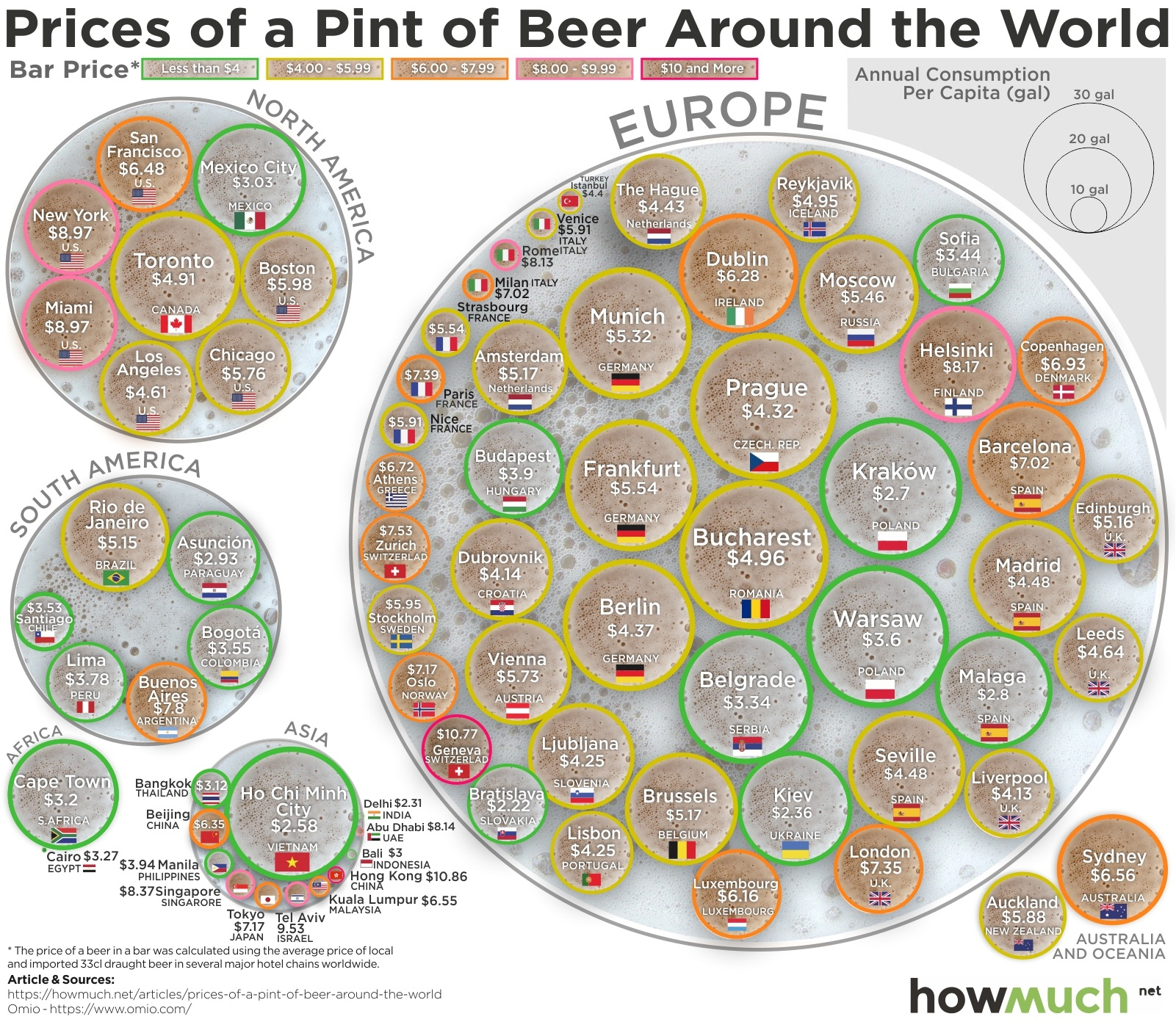 Det skal også bemærkes, at ifølge Wall Street Journal-dataene er ølprisen på pubberne genstand for forskellige grader af tillægsgebyrer. For eksempel er den dyreste supermarkedspris for øl 3,45 dollar i Oslo, hvilket stadig er betydeligt lavere end barpriserne i de fleste af byerne i infografikken. København markerer sig også i den dyre ende med en orange ring og en pris på 6,93 dollar. Stockholm sniger sig ned på en gul ring med en pris på 5,95 dollar.