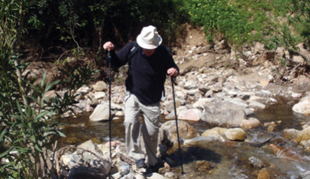 Grusvejen går nu jævnt nedad, og på et tidspunkt passerer vi to portlignende søjler. Vi går videre, indtil vi kommer ned til et sted, hvor vi skal krydse Manilva-floden. Der kan være masser af vand i floden, så tag eventuelt sko eller støvler af, når du krydser den.