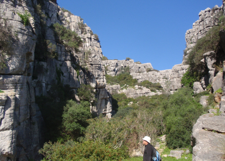 Vi passerer forbi restauranten ”Los Alamos” og parkerer ca. 500 m. inde ad grusvejen efter det lille kapel La Ermita San Adolfo. Turen starter et stort skilt og kort over El Canuto de la Utrera, hvor stien fortsætter ind i kløften.