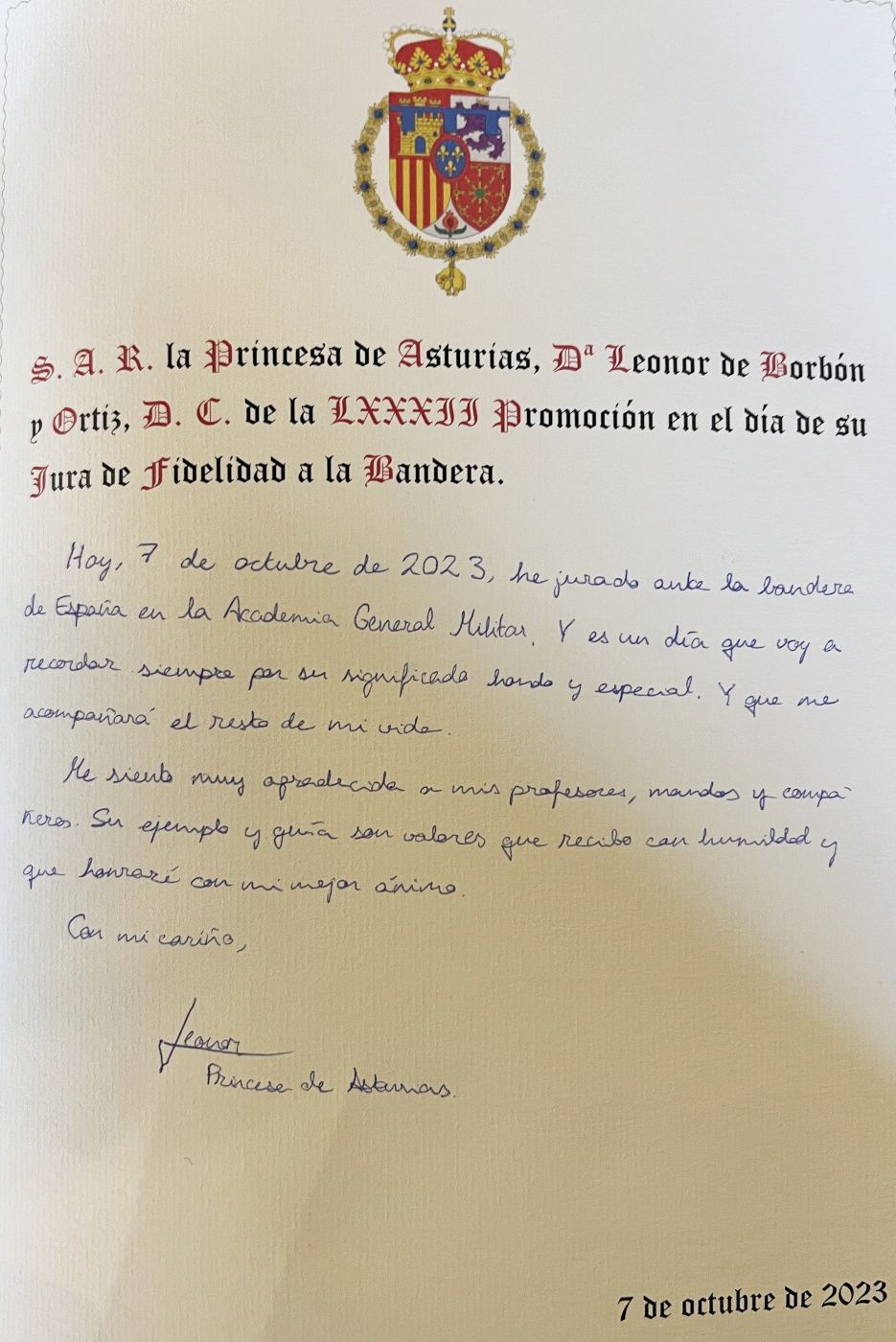 I dag, den 7. oktober 2023, har jeg aflagt ed foran det spanske flag på Academia General. Og det er en dag, som jeg altid vil huske for dens dybe og særlige betydning. Og den vil være med mig resten af mit liv.