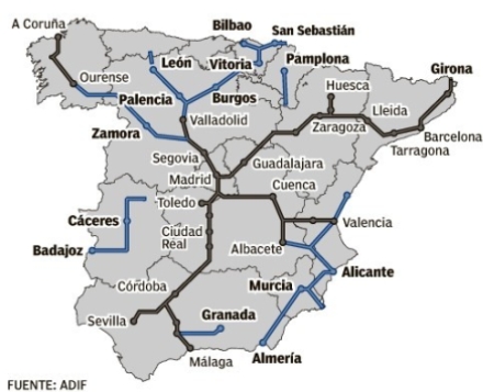 AVE-nettet i Spanien. Sort: ruter i funktion, blå: ruter under konstruktion