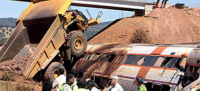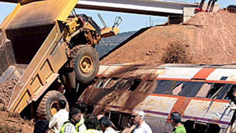 Lastbilen, som er af typen ”dumper”, transporterede materiale til opførelse af den ny AVE-togbane mellem Madrid og Lissabon, da den af ukendte årsager kørte ind over skinnerne.