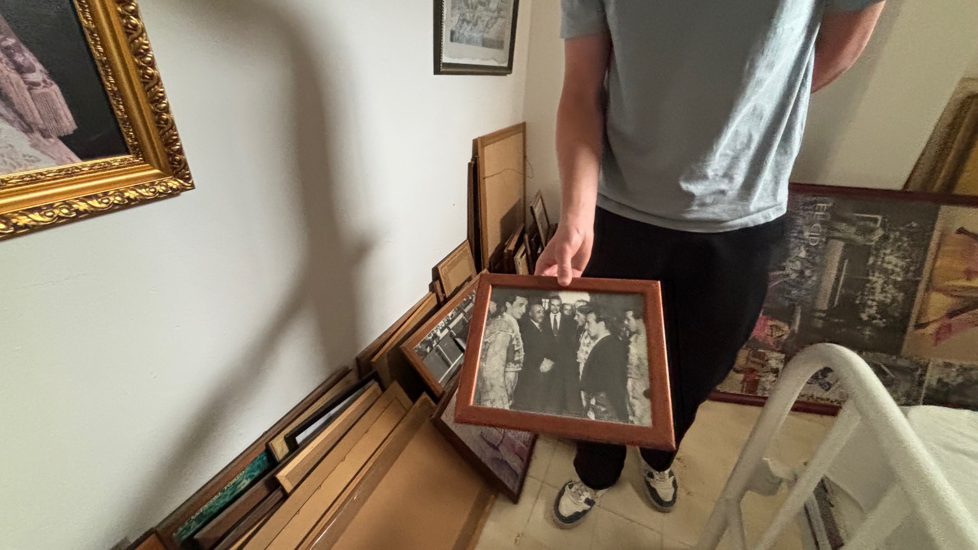 I den ene side står der en masse indrammede billeder stakket op langs væggen.