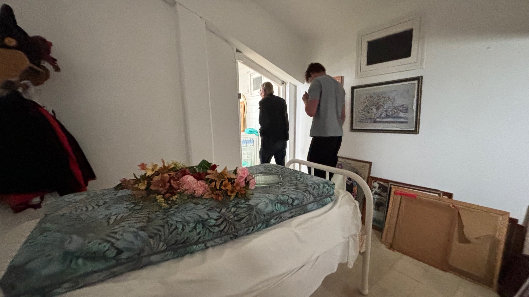I det tilstødende lokale finder vi sygestuen, hvor der ligger blomster på den ene seng - mon det er til de døde?