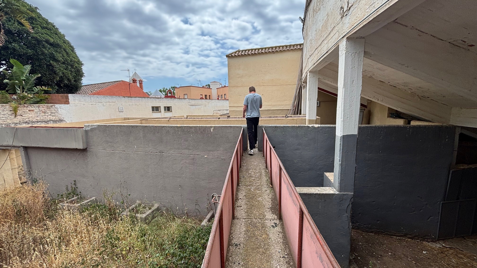 Så går vi en trappe op til der, hvor folk stod og tirrede tyrene med bambuspinde og vand - bare så de ikke trippede ind i arenaen og faldt i søvn. De skulle helst være helt oppe at køre! Ligesom nedenunder er det også en labyrint bare oppe i den fri luft og med frit udsyn til “underverdenen”.