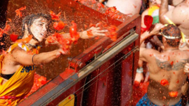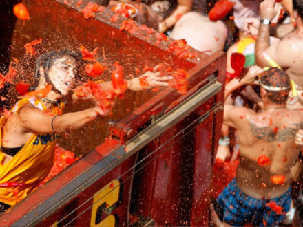 Spanske Tomatina fejres den sidste onsdag i august i Bunol i Valencia, når der hældes tonsvis af tomater på det lokale torv i byen. Traditionen går tilbage til 1945, da den startede som et ungdomsslagsmål.