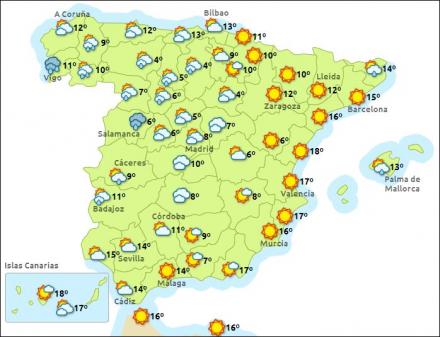 Tilbage til nutidens Spanien. Madrid får i dag overskyet vejr med byger og tre til otte grader, Barcelona skyet og 12 – 16, Valencia får fint vejr med sol og 12 – 17 grader og Málaga det samme med 11 til 16 grader.