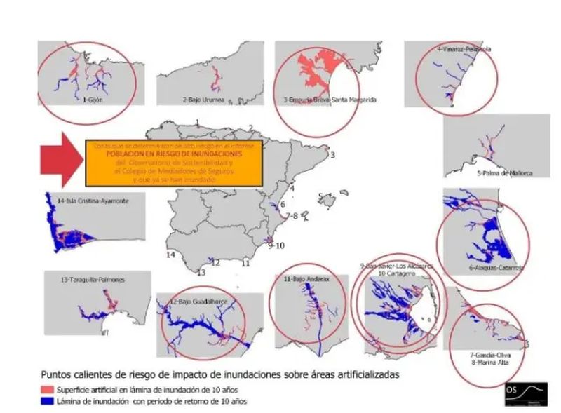 “På Middelhavssiden er der mange risikoområder, som generelt er koncentreret nær kysten eller omkring flodlejer af en vis størrelse”, siger rapporten og henviser især til floderne Turia og Segura. Dette svarer til den mest typiske dynamik i dette område, kraftig eller voldsom og rigelig nedbør, som forårsager betydelige oversvømmelser af vandløb, der normalt er tørre resten af året, som det skete med Poyo-kløften.