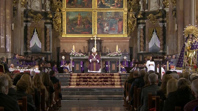 Indenfor indtog deres majestæter to røde fløjlsstole nær prædikestolen og pilgrimsbilledet af Virgen de los Desamparados, som bar en lilla kappe som tegn på sorg.