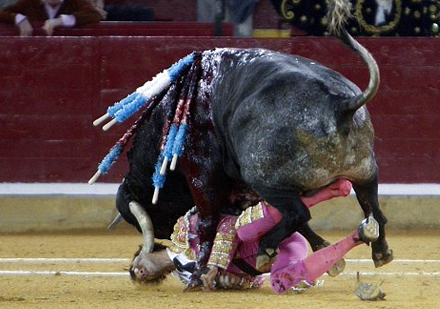 Da den sårede tyrefægter kom på benene, holdt han sig for ansigtet og skreg: "Jeg kan ikke se, jeg kan ikke se noget", mens blodet fossede ned ad ansigtet.
