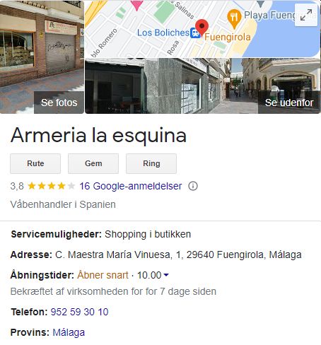 Jeg Googlede “armería autorizada Fuengirola” og denne poppede straks op: