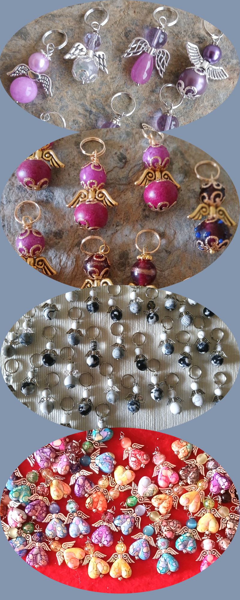 Udover de steder, hvor man kan finde mine engle, kan interesserede også altid kontakte mig via Messenger. Jeg kan dog ikke levere bestemte engle, fordi jeg får perler fra private, der er søde at donere gamle kæder, der måske er gået itu, eller som ikke bruges længere. Man kan altid ønske farver. Jeg har rigtig mange på lager, så der er rigeligt at vælge imellem.