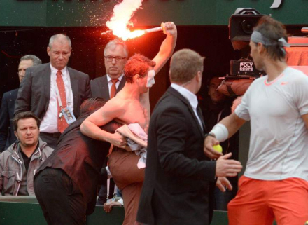 Uromagere var også til stede på center-court. Med råb, hujen, og romerlys forsøgte de at sabotere matchen. Spillet blev sat i pause, og uromagerne overmandet og ført ud.