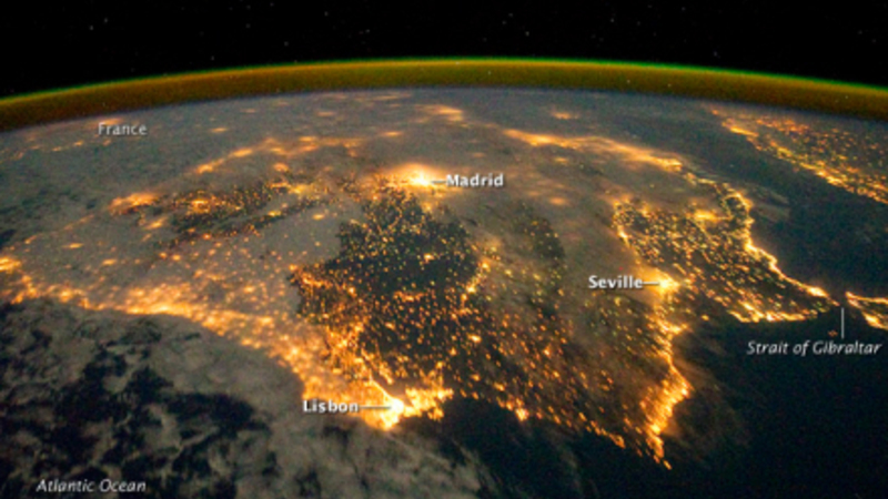 Og der blev lys! Et satellitfoto fra den internationale rumstation (ISS) viser, hvorledes storbyerne på den Iberiske Halvø med Spanien og Portugal ligger badet i lys.