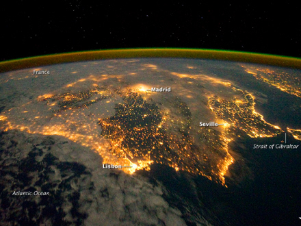 Selv belysningen i Frankrig ses ude i horisonten øverst til venstre, mens lysene i det nordlige Afrika ses til højre.