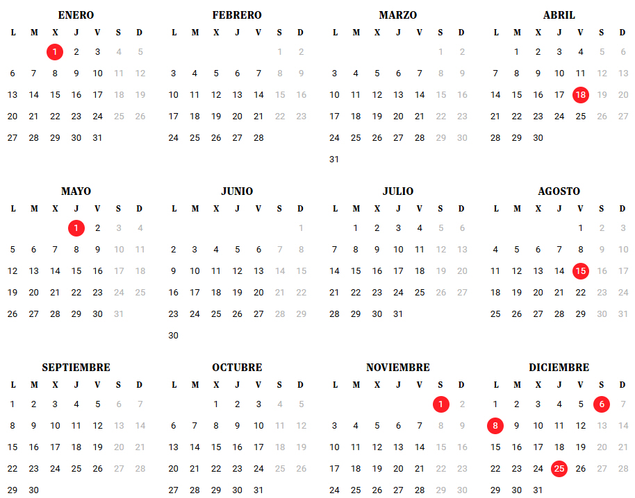 De otte helligdage i hele Spanien i 2025 er: 1. januar (onsdag, nytårsdag), 18. april (langfredag), 1. maj (torsdag, arbejdernes kampdag), 15. august (fredag, Asunción de la Virgen), 1. november (lørdag, allehelgensdag), 6. december (lørdag, den spanske forfatningsdag), 8. december (mandag, den ubesmittede undfangelsesdag) og 25. december (torsdag, juledag).