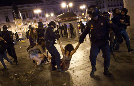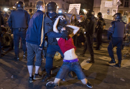 Urobetjente trængte tidligt i morges ind på pladsen i en halv snes politivogne, og det kom til flere deciderede slagsmål, inden pladsen var ryddet en time senere. Også i La Palma de Mallorca og i Valencia har politiet fjernet demonstranter. Her blev i alt to personer anholdt og 81 visiteret.