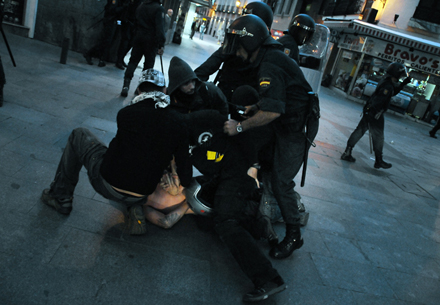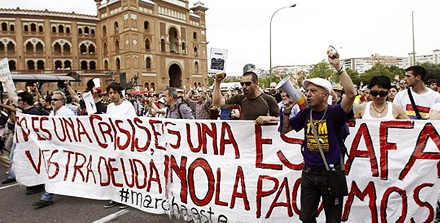 I Madrid samledes flere tusinde demonstranter sig i løbet af lørdagen på det centrale torv Puerta del Sol, der sidste år var skueplads for de omfattende protester mod den økonomiske politik og forringelse af borgernes rettigheder.