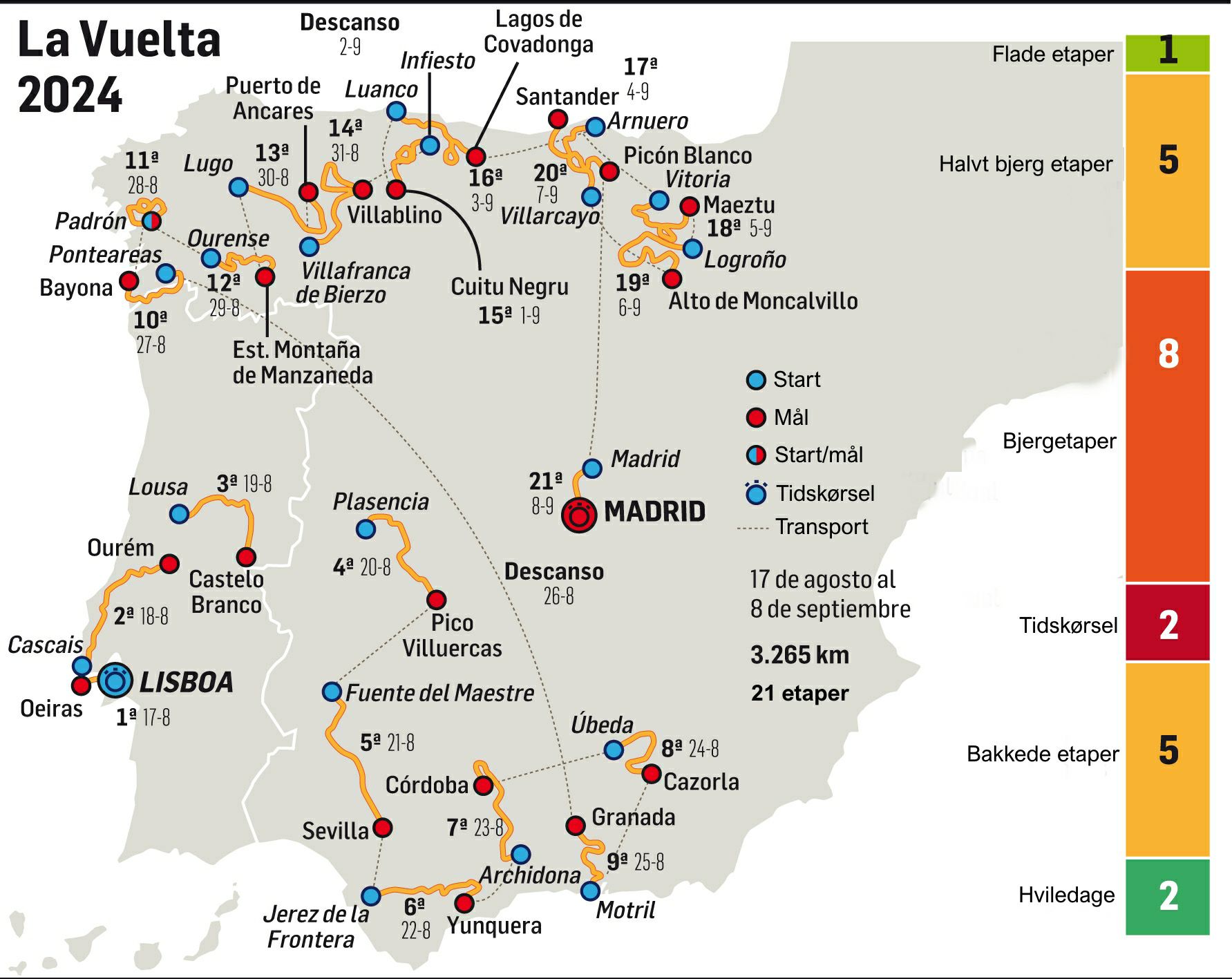 På lørdag starter løbet med tidskørsel i Lissabon og derefter er der yderligere to etaper i Portugal, inden La Vuelta vender hjem til Spanien.