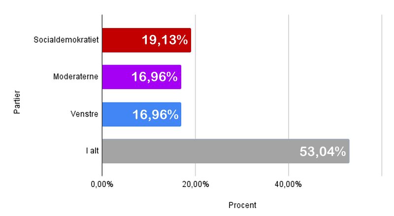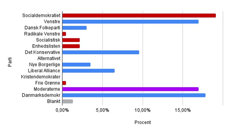 Fra tidligere afstemninger ved vi godt, at vores læsere overvejende er mere blå end røde. Men det har dog overrasket os lidt, at både Mette Frederiksens Socialdemokrater, Lars Løkke Rasmussens Demokrater, Jacob Ellemann-Jensens Venstre og Inger Støjbergs Danmarksdemokrater stort set er lige store.