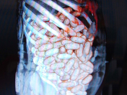 Efter at have undersøgt manden, besluttede tolderne, at en scanning af mandens mave var nødvendig – og her viste der sig at være jackpot. Den indeholdte masser af små ampuller med narko.