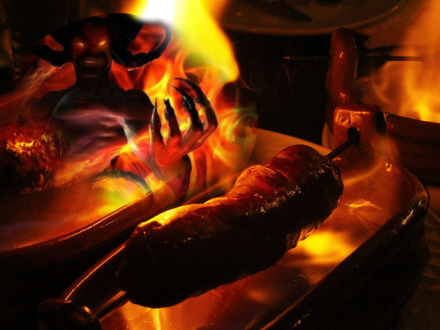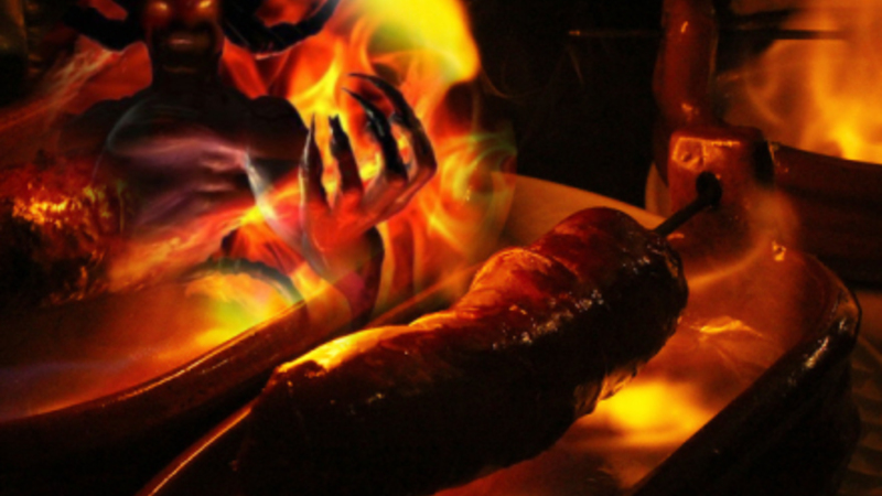 Romantisk ferie-middag for to endte med en tur på sygehuset, da et hollandsk turistpar tirsdag blev indlagt med alvorlige forbrændinger. De var gået på restaurant og havde bestilt den infernalske ret med navnet: 'Helvedespølser'.