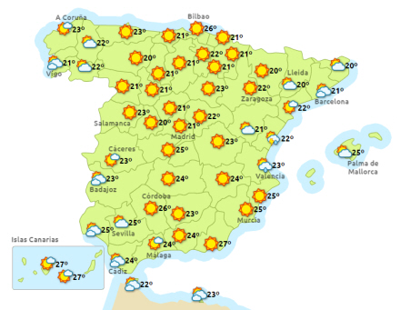 Dagtemperaturer vil være faldende i den østlige del af fastlandet, på Balearerne samt i dele af Nordvestspanien, mens den stiger svagt på den østlige Cantabriske kyst og i Pyrenæerne. I resten af landet er det ingen nævneværdige ændringer i temperaturen.