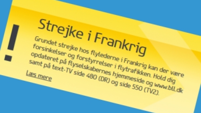Én af Spanien i Dags opmærksomme læsere skrev til redaktionen onsdag morgen: Jeg sidder i Billund med aflyste og forsinkede fly på grund af fransk flyvelederstrejke som åbenbart også fortsætter de næste seks dage. Læseren var skuffet over vores artikel fra forleden om flyvelederstrejke. Vi ser på sagen.