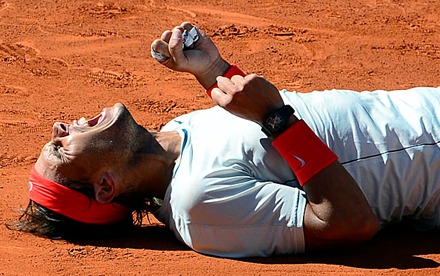 Rafa Nadal kaster sig traditionen tro i gruset efter sejren