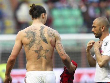 - Han er svensk, men vi er nødt til at have ham med. Han har det hele - en rød drage på ryggen, en japansk koi-fisk (den er valgt, fordi den svømmer mod strømmen, som Zlatan gør det), en indianerfjer på ryggen, "Only God Can Judge me" (Kun Gud kan dømme mig) på hans ribben og hjerter es på maven. Han er åbenbart afhængig af tatoveringer. Jeg forstår det. Det er vi andre også, siger Christian Stadil om Zlatan Ibrahimovic, som får nummer tre på listen.