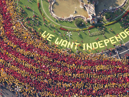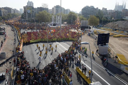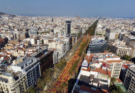 Catalanerne fejrede deres nationaldag i går med en kæmpe anlagt manifestation, hvor tusindvis af mennesker var på gaden, hvor de med stillede sig i røde og gule kolonner og dannede et 11 kilometer langt symbol i det catalanske flags farver.