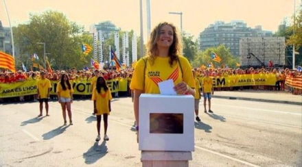 Menneskemængden formede et gigantisk ”V”, for at opfordre folk til at stemme d. 9. november. Ceremonien endte med, at en pige symbolsk puttede en seddel i en stemmeurne, mens hun havde et 11 kilometer langt menneskeligt ”V” for ”Vote” - eller på catalansk ”Voti” - i ryggen.