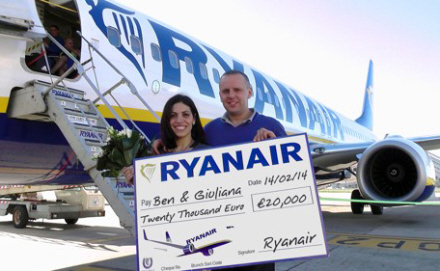 "Ja" lød svaret, da Ben friede til sin italienske kæreste i 12 kilometers højde ombord på et Ryanair-fly. Og lavprisgiganten smider 20.000 euro efter parret, så mon ikke det bliver et bryllup, man kommer til at huske?