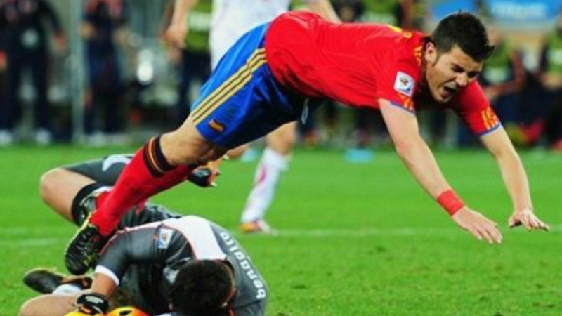 Foto: Spanske David Villa (flyvende) tackles af den schweiziske målmand Diego Benaglio.