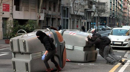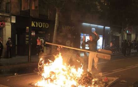 I forstadskvarteret El Sants blev 20 personer i går anholdt af urobetjente, da demonstranter satte ild til containere og ødelagde facader på flere banker i området.
