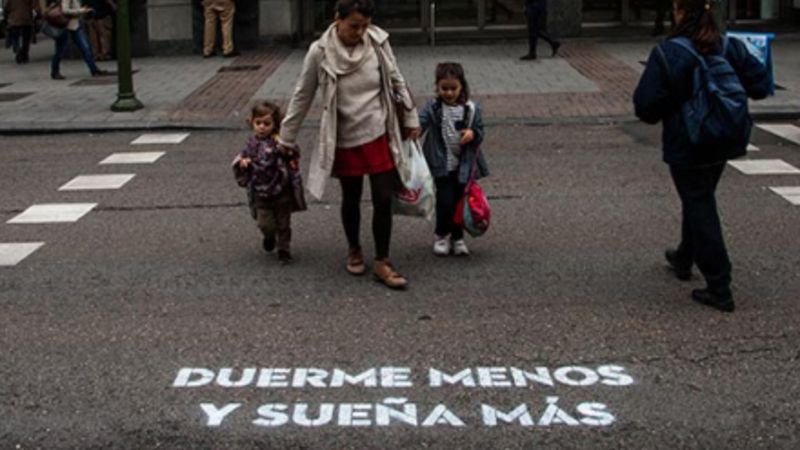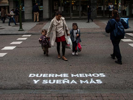 ”Sov mindre, drøm mere” er et eksempel på vers, der konfronterer de mennesker, der krydser vejen til fods.