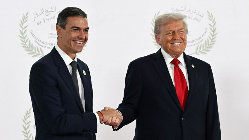 Trump modtog hver eneste international leder i den egyptiske by Sharm el Sheikh, som deltog i Peace 2025 om Gaza, og da det var Sánchez' tur, gav han ham et solidt håndtryk under smil fra begge sider.