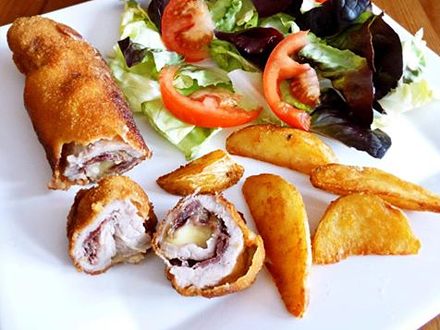 Spred fileterne ud, bank dem, krydr dem og læg derefter en skive skinke og lidt hårdkogt æg på hver enkelt. Rul dem op, og forsøg at lukke dem tæt. Spid dem med en tandstikker, så de ikke åbner sig under stegningen. Dyp rullerne i pisket æg og rasp og steg dem i olie.