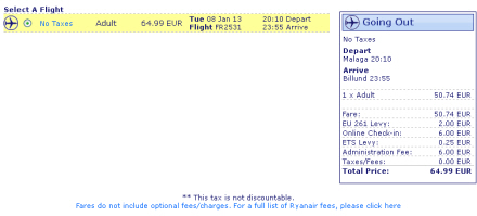 En hurtig søgning på momondo.com viser, at Ryanairs pris på Málaga - Billund tur/retur koster under halvdelen af den næstbilligste med AirFrance. Dog skal du lige huske på, at de mange, mange, mange gebyrer ikke er inkluderet i de 129 euro. Den reelle pris ender på 144,16 euro. Men så har jeg heller ikke købt bagage.