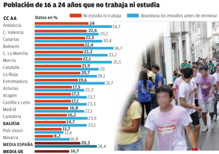 I løbet af årene fra 2008 til 2010 steg antallet af ikke-beskæftigede unge i Spanien med syv procent, hvilket er den tredjehøjeste stigning kun overgået af Irland og Estland.