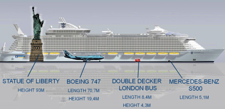 Det er 60 meter højt, hvilket er 15 meter højere end kranerne på industrihavnen. Der er plads til 6.360 passagerer, som serviceres af 2.394 besætningsmedlemmer.