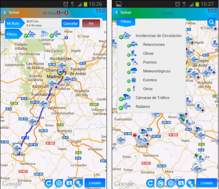 Når du åbner app'en er der tre muligheder på forsidens menu: mi ruta, información de tráfico og emergencias. Selv om du ikke kan spansk, behøver jeg næppe oversætte dem...