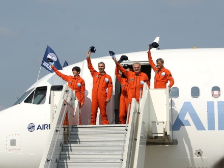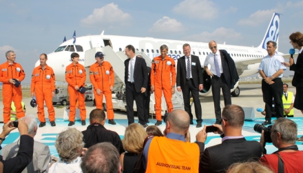 Omkring kl. 14:15 landede besætningen i Toulouse-Blagnac lufthavnen, efter en flyvning på 2 timer og 15 minutter, hvor de blev mødt med stor jubel. Klædt i orange dragter virkede de næsten som en rum-besætning, da de stod øverst på flytrappen. Airbus' administrerende direktør, Fabrice Brégier, roste og takkede alle de involverede parter, nu hvor alt var gået præcis, som man havde håbet på.