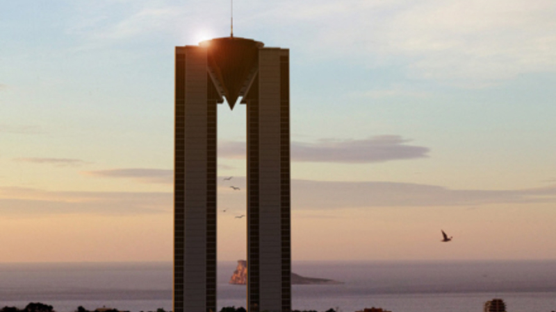 En af Europas højeste bygninger har kun elevator i bunden. Det lyder umiddelbart som en joke blandt arkitekter, men det er alligevel sagen i Intempo-bygningen i Benidorm, Alicante. En udvidelse fra 20 til 47 etager betyder, at elevatoren kun går til 20. sal.