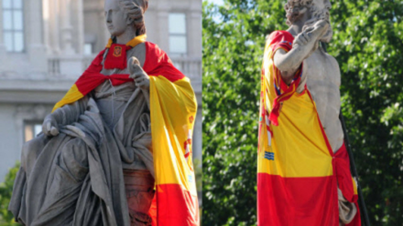Med spaniernes sans for at fejre selv mindre sejre, er det allerede besluttet, at der mandag aften skal være fest for det spanske landshold på La Plaza de Cibeles i Madrid. På billedet ses guderne Cibeles og Neptun, da de var klædt på til at modtage VM-mestrene i 2010.