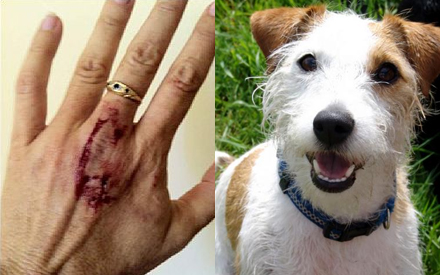 Suzannes hånd efter angrebet. Til højre ses en (tilfældig) hund af racen Jack Russell Terrier