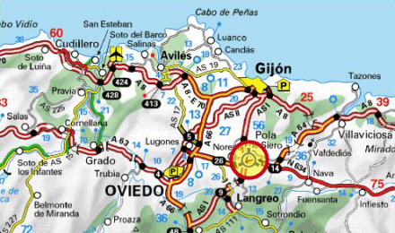 Pola de Siero ligger nær Gijón. Klik for interaktivt kort på ViaMichelin.