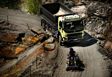 Filmen viser, hvordan den store lastbil langsomt og anelse snørklet kører op gennem stenbruddet ad en smal, kuperet grusvej.