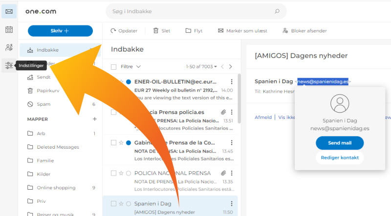 Gå til din mail og klik på Indstillinger: