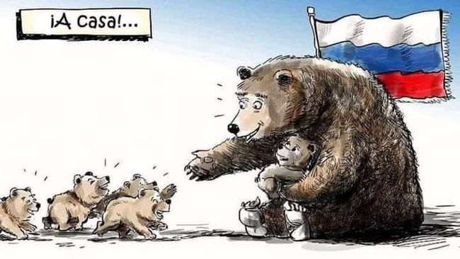 Karikaturen, der er gået verden rundt, viser en stor bjørn (mama bjørn), som om den var Rusland, og fire bjørneunger, der med glæde nærmer sig den. A Casa! - Kom hjem.